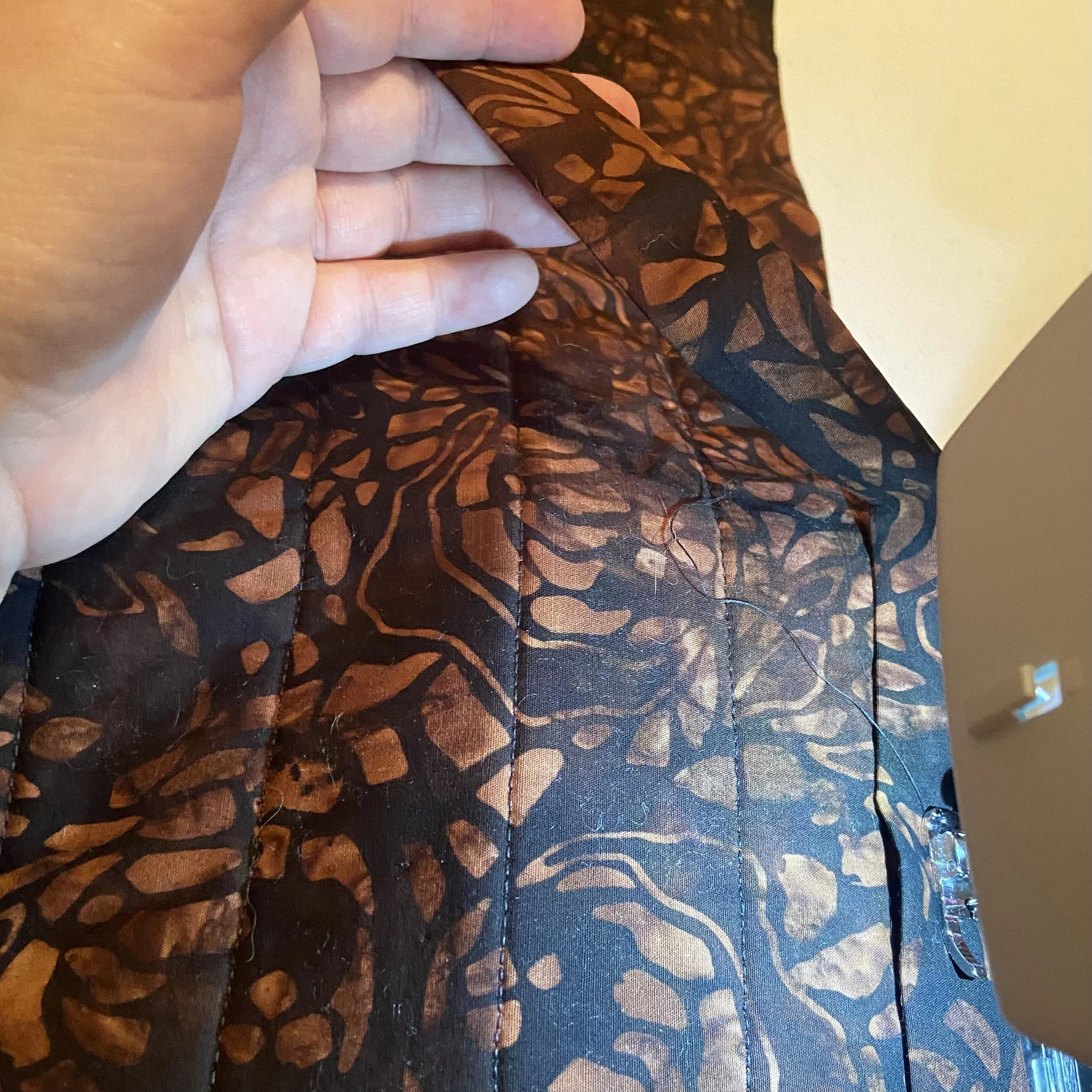 Alas, that was the last of the magic I got to enjoy on this project, because this is where I realized I’d cut and attached binding that was too narrow. I suppose a smarter, more dedicated quilter would have ripped out the binding seam, and started again with binding that was the right width. But I can be stubborn. ( “I can make this work!” The cry of the deluded amateur quilter…) Since I’d stitched the binding onto the back of the quilt, that seam was visible on the front panel, about 1/4” from the edge. I needed the binding to reach past that seam to cover it up. But the binding was just too short. I ended up wrestling it all the way, doing only 3-4 stitches at a time before I had to stop and yank the next section over and hold it in place with my little awl. I only managed to do about 2/3 of the binding before my hand was cramping so badly that I just stopped and left it for the next day. The mitered corners ended up quite messy, since I didn’t really have enough fabric to make them crisp and clean, but I decided to live with that too.