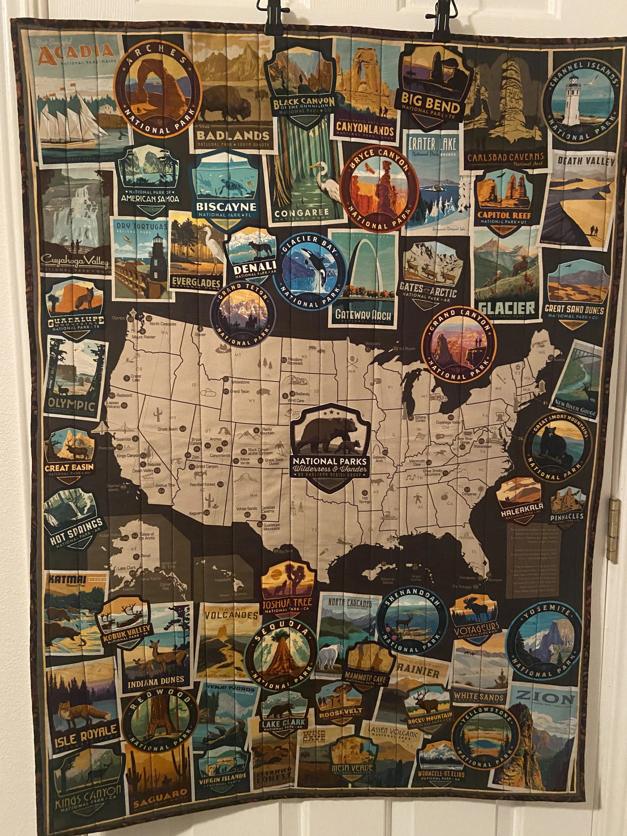 My usual store for quilting cotton let me down in this regard…JoAnn’s panel selection is sub-par. However, Craft Warehouse has a nice selection, and I ended up purchasing their National Parks panel, which was 36” x 43”, an excellent size for a baby’s quilt. I also bought a lovely reddish brown batik print fabric for the backing and the binding, and enough fusible fleece to get the job done.