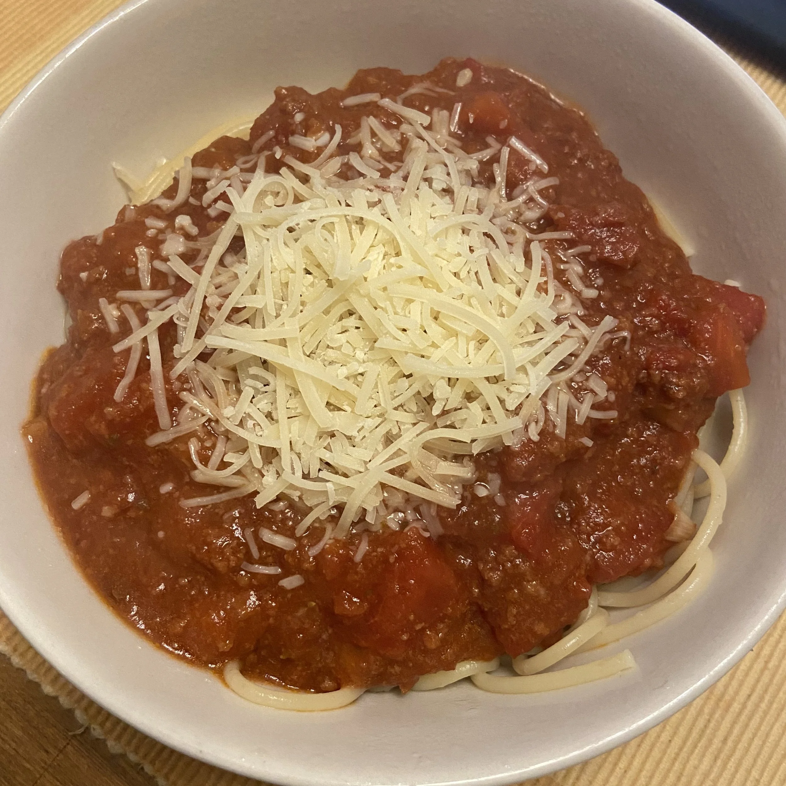 The ingredients are mostly staples you probably already have, with the exception of the beef. Into your crockpot put one pound of lean ground beef and break it up with a spoon or whatever tool you choose. I chose a potato masher, which works nicely. Then dump in all the rest of your ingredients, set the heat to low, and cook it anywhere from 4-8 hours. (The recipe says 4-6 hours, but really, this recipe is quite forgiving.) Serve it over pasta or rice, with a little parmesan topper. It’s even fabulous with macaroni, a combo my mother has called “goulash” since I was a child. Let’s be clear, it’s not really goulash. Just a rich spaghetti meat sauce served with macaroni. But…delish.