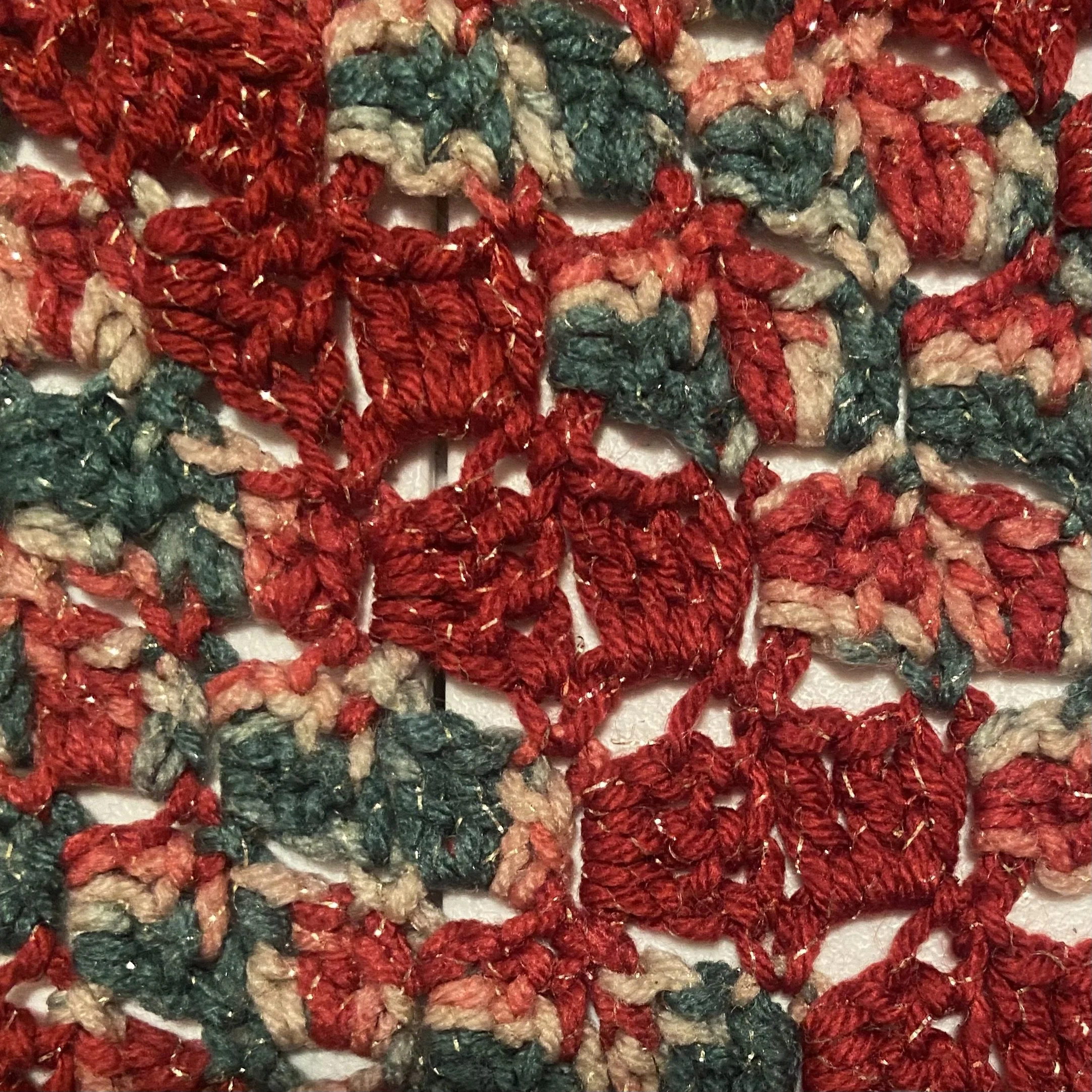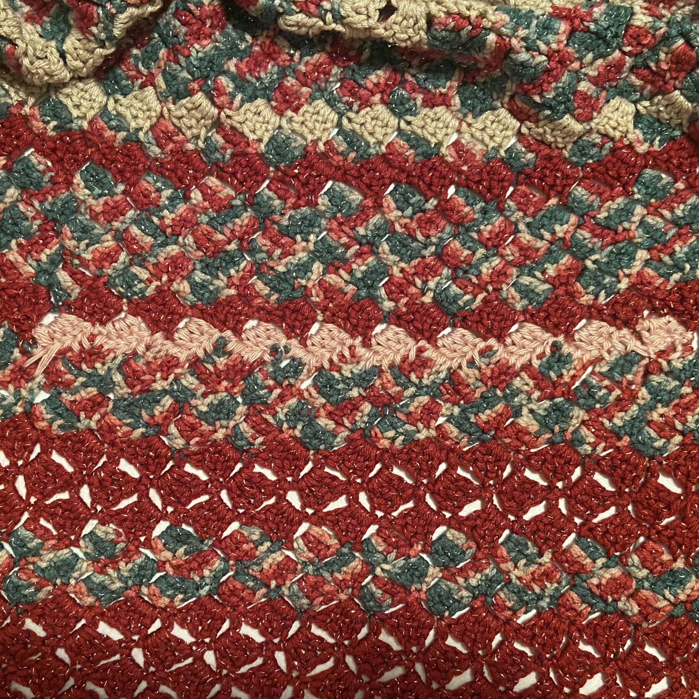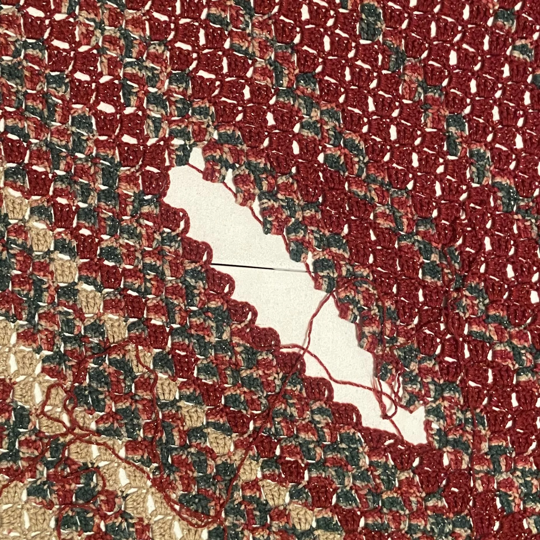 I’m sorry to have to report that I failed miserably. I tried multiple times, but for the life of me, I could not figure out how to both crochet the missing section one cluster at a time and attach it to all the still-intact clusters so that it would lay properly. I’m only including one picture of my multiple attempts, and this was the closest I got to getting it right. And it is definitely not right. Perhaps it might have been different if the yarn I was using hadn’t still been attached.