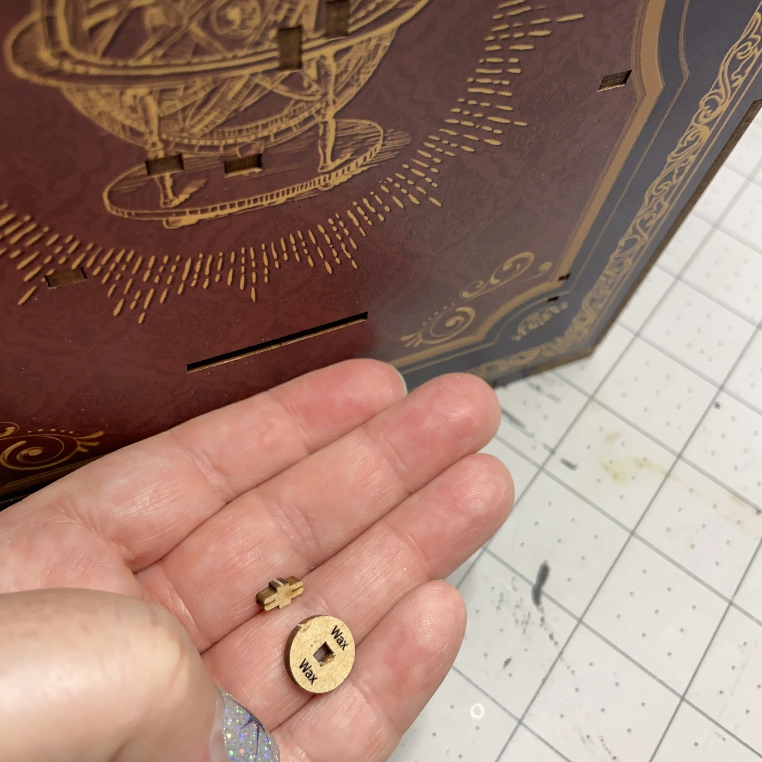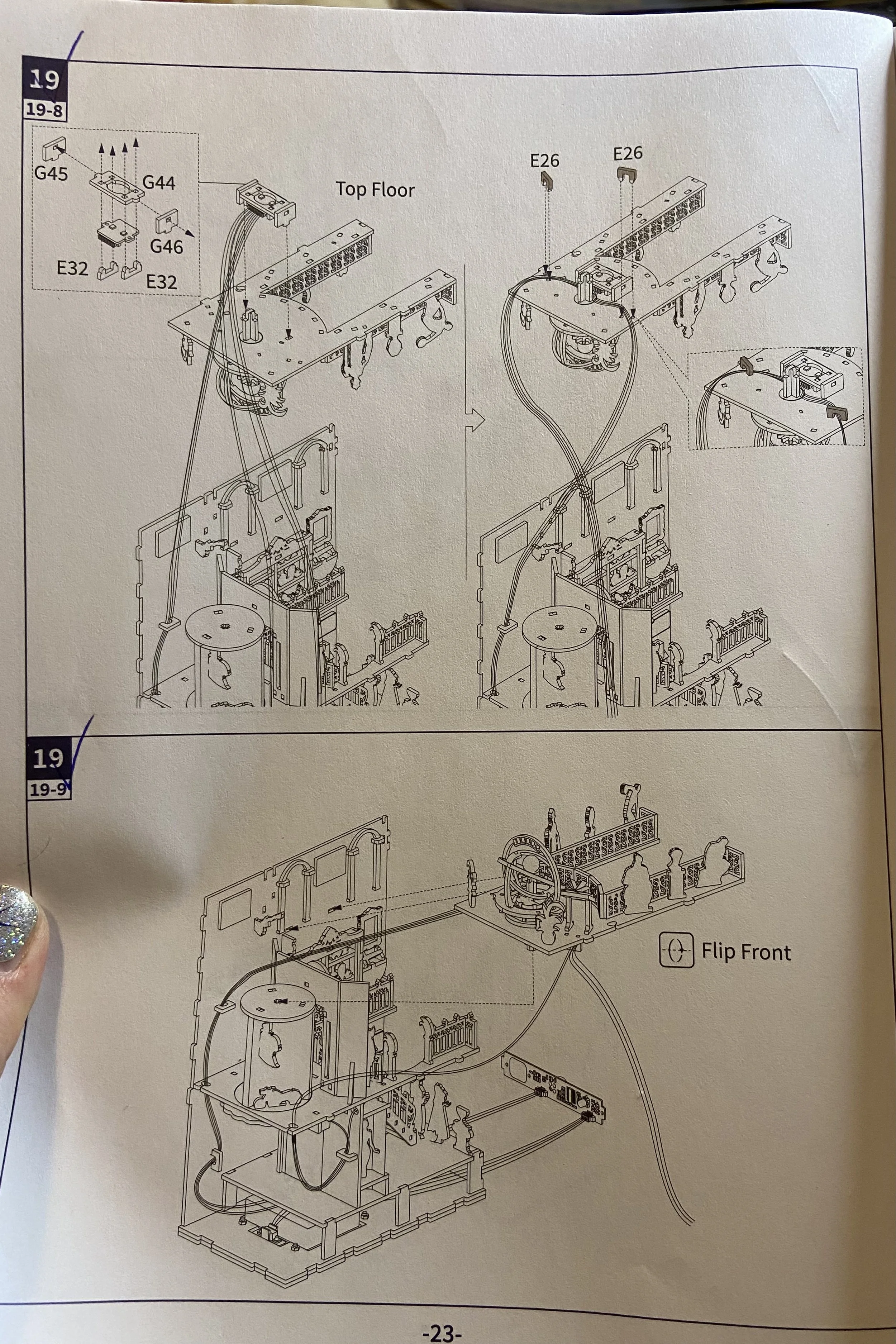 As usual with Tonecheer, their directions were (mostly) clear. For example in the first photo below, you can see that one side of the piece needs to be waxed (to help it slide, as it’s a moving part), with the directions showing the area for waxing as well as which side of the piece to wax. In the second picture, you can see that the ornamental piece that is to be glued onto a wall is labeled both on the piece and the wall. Very convenient, given how similar a lot of these pieces are. In the third picture, the outlines of the gears are on the structural piece, with a blue indicator showing where to line everything up. I’m sorry to have to report that even with all this help, I initially installed the gears on the wrong side and had to reposition.
