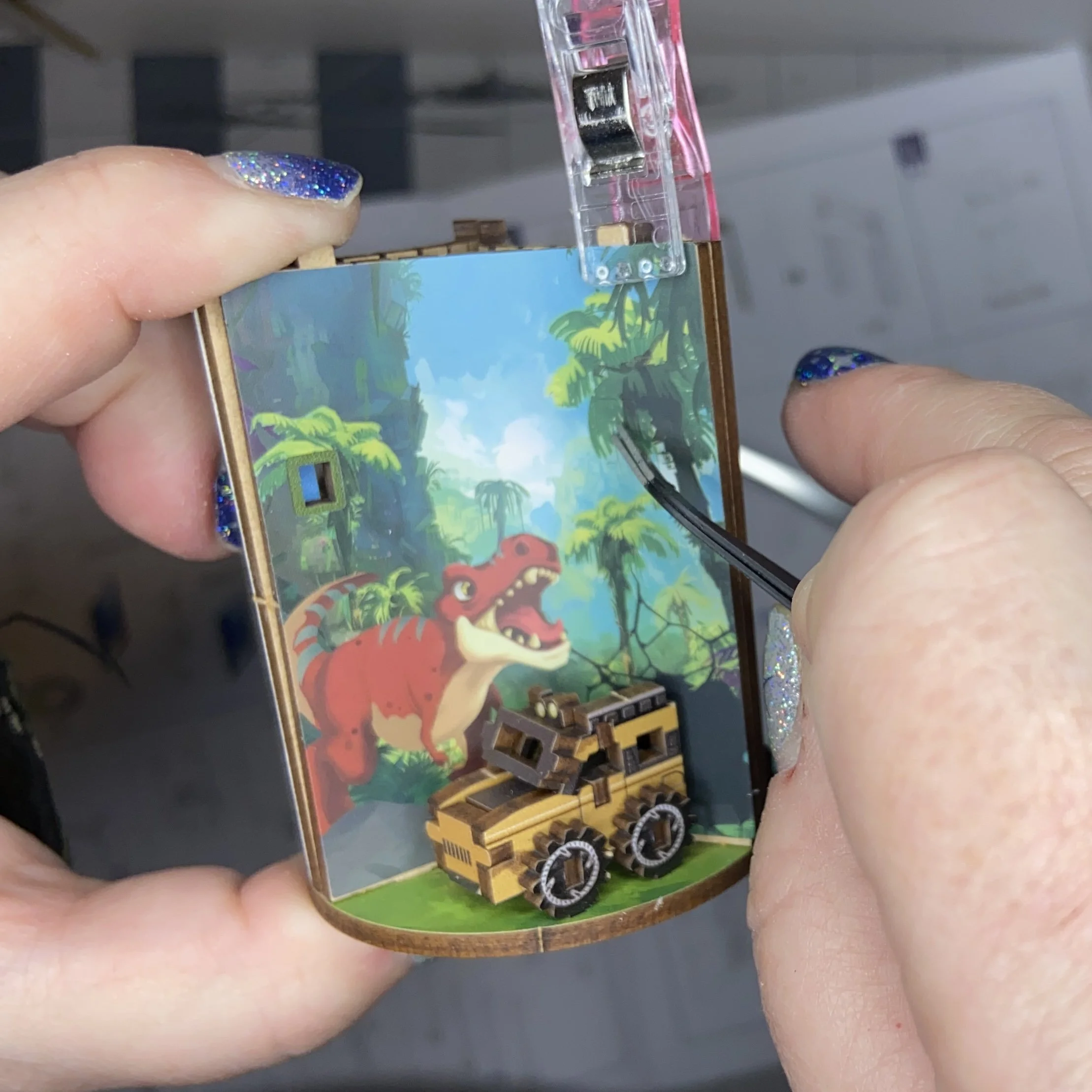 It was only a little later, when I judged the glue had dried enough to allow me to work on other sides of the carousel, that I realized there were tiny cutouts in the pictures, which peeled easily away to expose the slot. I felt like a right idiot. The palm branches notched into the jungle picture, right where they were supposed to go. Ah well, live and learn. Honestly, I should have known Tonecheer had arranged something clever and perfect…