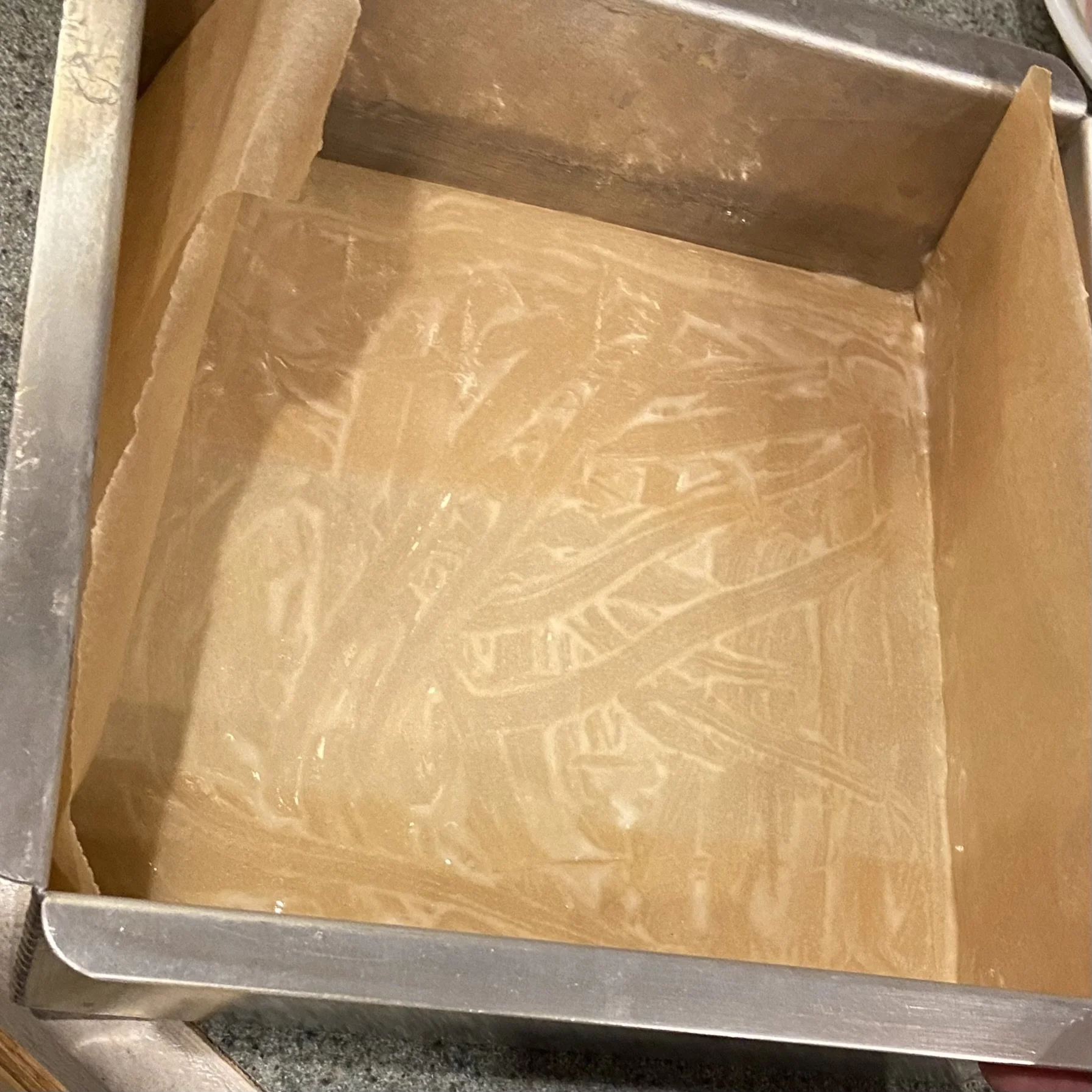 I inserted some parchment paper into the bottom of an 8x8” baking pan, with enough coming up two sides that I could lift the dessert out when it was cooked. I also put some baking spray on the parchment, although that turned out not to be necessary.