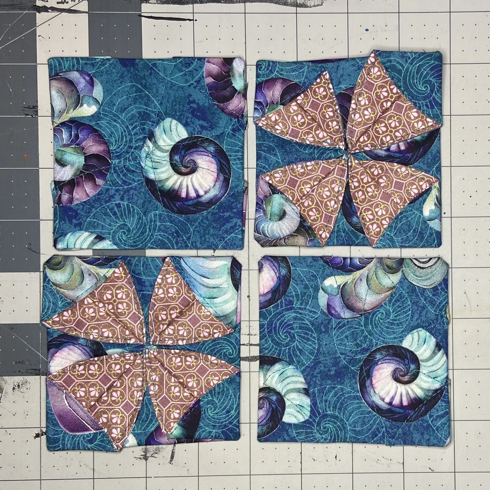 This week, it’s coasters again. Start by cutting out four 8.5” squares out of two different cotton prints, for a total of eight pieces. Then fold one piece into quarters, and use a compass to mark a 4” radius/circle (arc, in this case). My cheap compass (left over from my school days) will not hold a pen, only a pencil. So once I’d made an almost invisible pencil mark, I traced over it with a ballpoint pen. Then I pinned the fabric so that the layers would not shift around, and cut along my line.